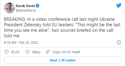 FX168财经报社(北美)讯 周五(2月25日),乌克兰总统泽连斯基在一次电话会议上告诉欧盟领导人,这“可能是你们最后一次看到我活着”,因为俄罗斯军队正在推进对乌克兰的进攻。