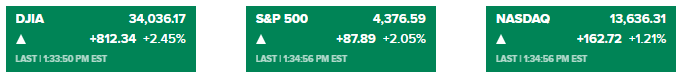 道琼斯指数上涨超800点或近2.5%,有望创下今年的最佳表现。标普500指数上涨近2.1%,纳斯达克综合指数上涨1.2%。