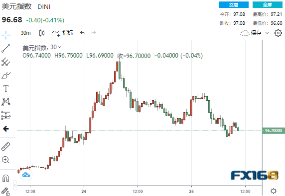 美市盘中,美元指数一度下跌约0.5%,至96.60低点。不过,早些时候的波动幅度意味着,美元指数本周仍有望上涨0.8%。