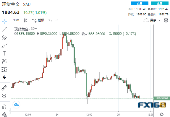 美市盘中,现货黄金持续走低并刷新日低至1882.79美元,较日高回落近40美元。