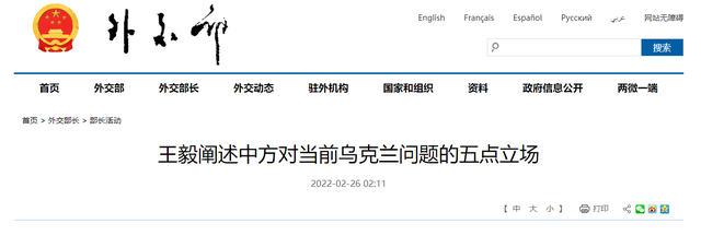 2022年2月25日,中国国务委员兼外长王毅应约分别与英国外交大臣特拉斯、欧盟外交与安全政策高级代表博雷利和法国总统顾问博纳通电话,重点就乌克兰局势深入交换意见。王毅阐述了中方对乌克兰问题的基本立场,概括为以下五点: