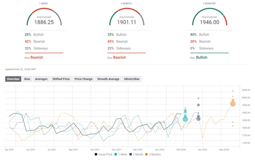 FXStreet预测调查显示,短期内黄金略显看跌倾向,一周平均目标位为1886美元。一个月的前景好坏参半。