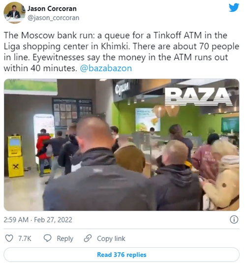 OANDA高级市场分析师表示:“俄罗斯周末已开始出现银行挤兑……通胀将立即大幅窜升,俄罗斯银行体系可能陷入麻烦。”