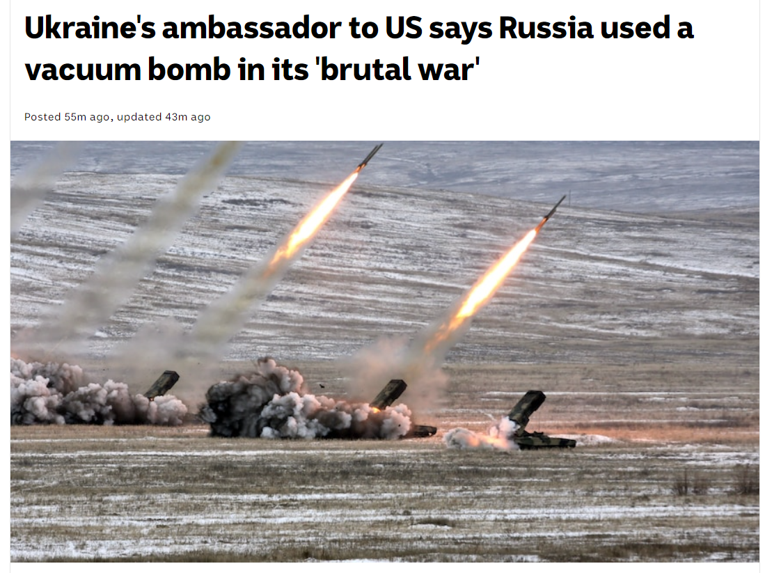 路透社报道,乌克兰大使玛卡罗娃(Oksana Markarova)与美国国会议员见面后说:“他们在当地时间2月28日使用真空弹,这实际上是日内瓦公约所禁止的,俄罗斯试图对乌克兰造成严重破坏。”她说,乌克兰与美国总统拜登政府、美国国会积极合作,以取得更多武器与更严厉的制裁。