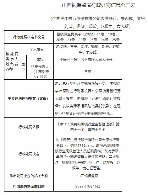 3月19日,中国银保监会网站披露的罚单显示,民生银行太原分行因存在6项违法违规问题,被责令改正并处以罚款1710万元。山西银保监局于2022年3月16日作出前述处罚决定。