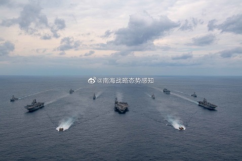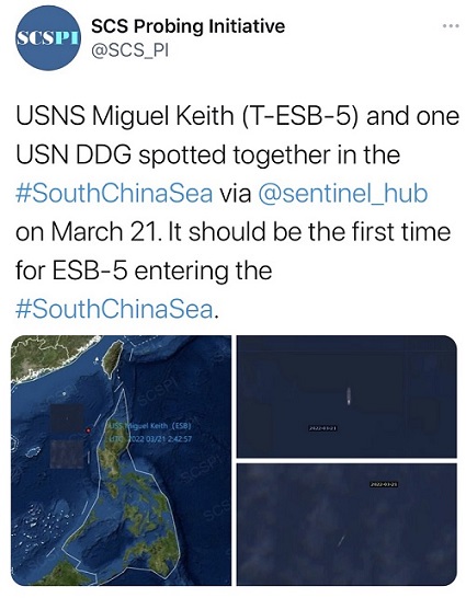 长期关注美军动态的中国半官方机构“南海战略态势感知计划”(SCSPI)指出,3月21日上午10时许,“哨兵”卫星在南海巴士海峡西南发现了美国海军“米格尔·基思”号远征基地舰和一艘美国“伯克”级驱逐舰。