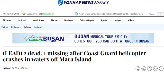 FX168财经报社(香港)讯 韩国官员周五(4月8日)称,一架海岸警卫队直升机周五在韩国最南端的马罗岛附近海域坠毁,造成两名船员死亡,另一人失踪。直升机坠海原因目前还在调查。此前一艘载有6名韩国公民的船只在台湾附近海域失踪。