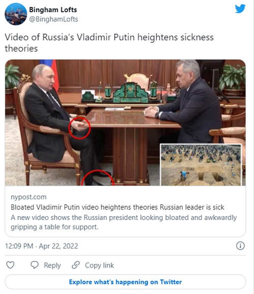 基辅独立报备受尊敬的国防记者波诺马连科发推说,“这只是我(的问题)还是普京真的随着战争每一天过去,就看起来更不健康了?”、“现在和2月底之间,我可看出(普京外观)有巨大差异”。