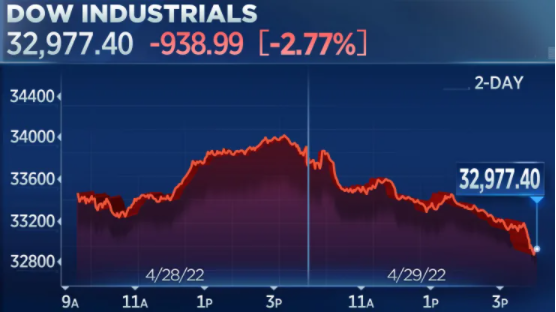 纳斯达克综合指数下跌4.17%,至12334.64点,受亚马逊财报发布后暴跌的拖累。标普500指数下跌3.63%,至4131.93点。道琼斯指数下跌939.18点,至32977.21点,跌幅2.77%。