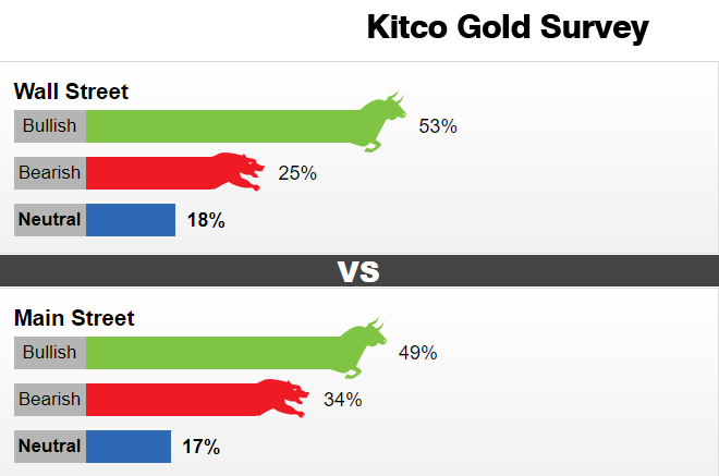 与此同时,面对普通投资者的网上投票共有904人参与。在这些受访者中,有446人(49%)预计金价下周将上涨。另有306人(34%)预计金价将下跌,另有152人(17%)表示近期持中立态度。