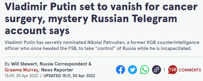 他们继续说道:“所以,普京接受手术并恢复理智……可能需要两三天……国家的实际控制权只会移交给帕特鲁舍夫。”