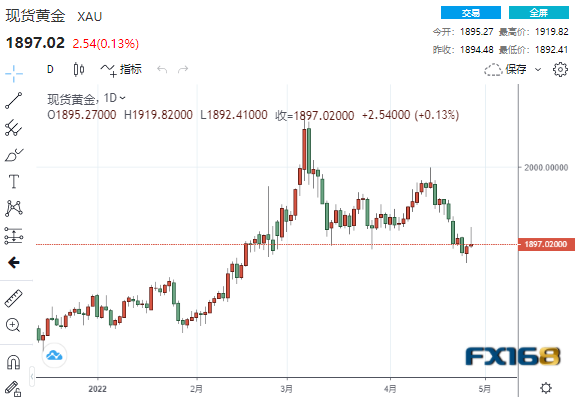 周五(4月29日),美市尾盘,现货黄金收报1897.02元/盎司,上涨2.54美元或0.13%,日内最高触及1919.82美元/盎司,最低触及1892.41美元/盎司。本周,现货黄金下跌34.13美元或1.77%。