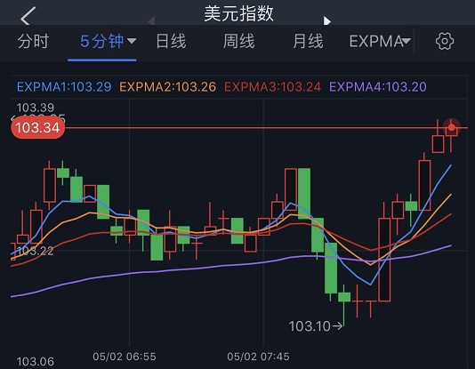 美元指数亚市早盘一度跌破103.10,但随后短线快速上涨,目前交投在103.35附近。