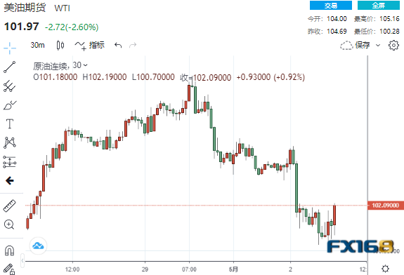 布伦特原油期货下跌3.23美元或3%,至103.91美元/桶。美国西德克萨斯中质油(WTI)期货一度下跌超4%,至100.28美元/桶低点。