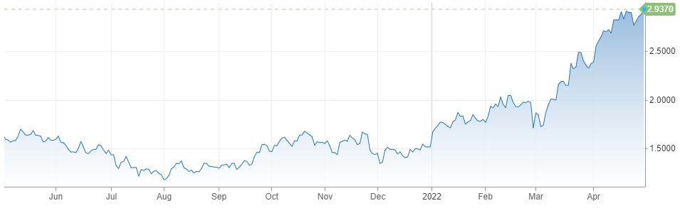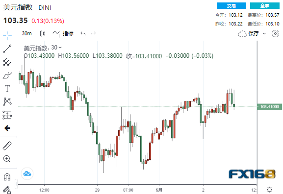 美元指数延续涨势,日内最高触及103.57。美元指数在4月份上涨了5%,为自2015年1月以来表现最好的一个月。