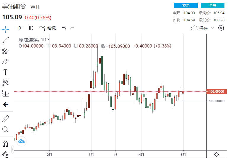 截至发稿,美国WTI原油期货上行0.95美元,涨幅0.92%,现报105.08美元/桶;布伦特原油期货上探1.17美元,涨幅1.10%,报107.66美元/桶。