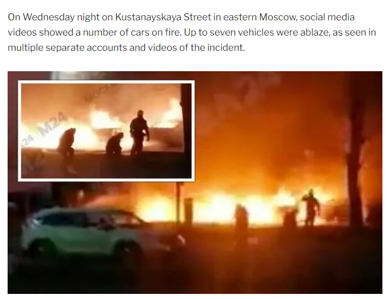 英国每日快报提到,在莫斯科东部的Kustanayskaya街,社交媒体视频显示多辆汽车着火。 从事件的多个单独帐户和视频中可以看出,多达7辆车着火。在社交媒体发布的一段视频中,听到爆炸声,大火在街上肆虐。