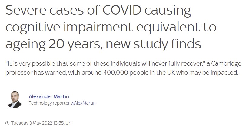 FX168财经报社(北美)讯 据《天空新闻》周二(5月3日)报道,英国剑桥大学和伦敦帝国学院的研究人员团队发现,感染过新冠并引发重症的患者,认知能力的退化等同于衰老20岁。