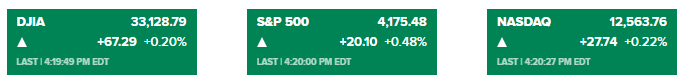 标普500指数上涨0.48%,收报4175.48点;道琼斯指数上涨67.29点或0.20%,收报33128.79点;纳斯达克综合指数上涨0.22%,收报12563.76点。