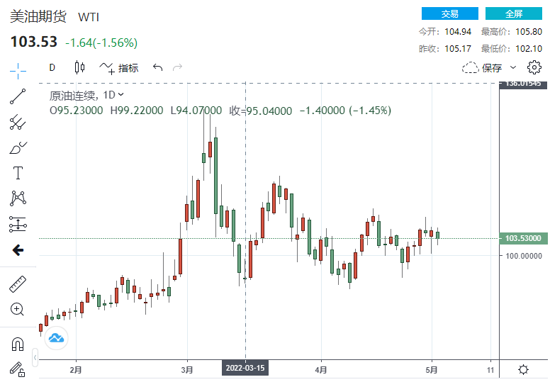 截至发稿,美国WTI原油期货下行1.50美元,跌幅1.42%,现报103.48美元/桶;布伦特原油期货下探1.68美元,跌幅1.57%,报105.89美元/桶。
