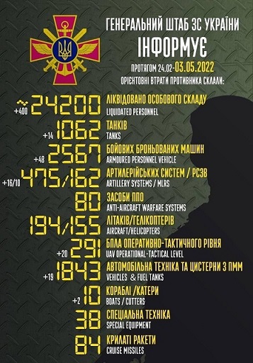 乌克兰国防部在官方推特发文称,自俄罗斯2月24日入侵至5月3日上午6点整,俄军约24200人阵亡,乌军摧毁俄军1062辆坦克、2567辆装甲车、475门火炮系统、162辆多管火箭车、80组防空系统、194架军机、155架直升机、1843辆各式车辆&油罐车、10艘舰艇、291架无人机以及38个特殊设备。