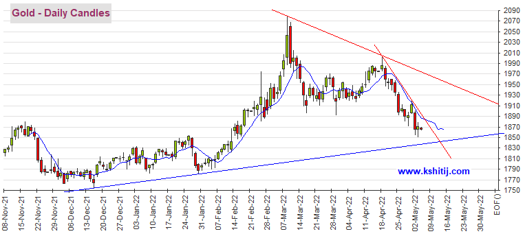 根据Kshitij咨询服务团队,假如黄金期货跌破关键水平1850美元/盎司,后市可能进一步暴跌。