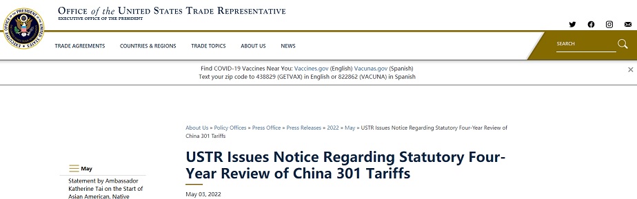 USTR宣布,四年前依据所谓“301调查”结果对中国输美商品加征关税的两项行动将分别于今年7月6日和8月23日结束。即日起,该办公室将启动对相关行动的法定复审程序。