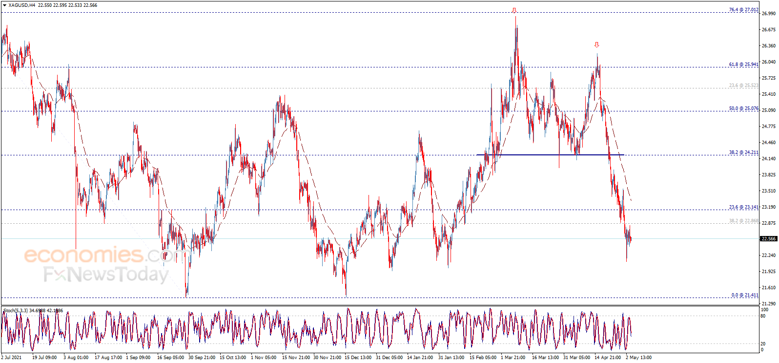 Economies.com称,从4小时图来看,EMA 50指标对银价形成看空压力。目前我们正等待银价测试下一主要目标22.00美元/盎司,更下方目标在21.40美元/盎司。