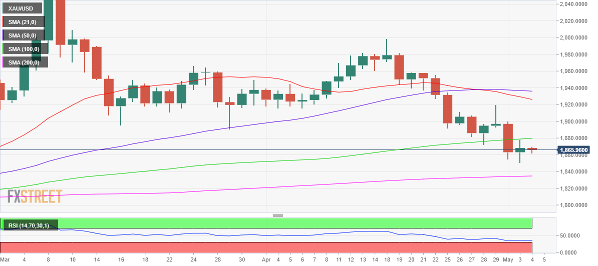 Mehta表示,假如美联储政策前景激进,暗示6月加息逾50个基点,黄金可能加速下行动能,并触及200日移动均线切入位1835美元/盎司。