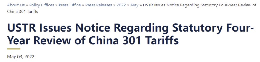 USTR声明中指出,针对上述两项行动,美国企业代表提出申请的时间段分别为5月7日至7月5日,6月24日至8月22日。