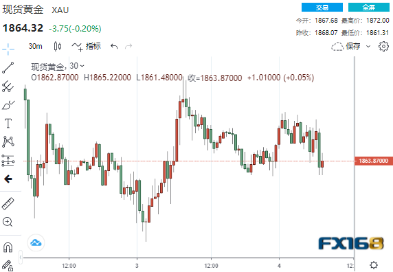 美市早盘,现货金短线下跌约8美元,刷新日低至1861.31美元。