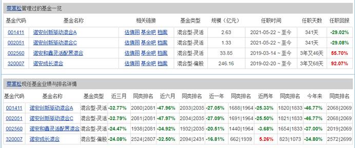 从蔡嵩松的任职回报来看,诺安创新驱动混合任职以来的回报极差,截止2022年4月28日,2022年累计亏损46.77%,在同类排名中垫底。