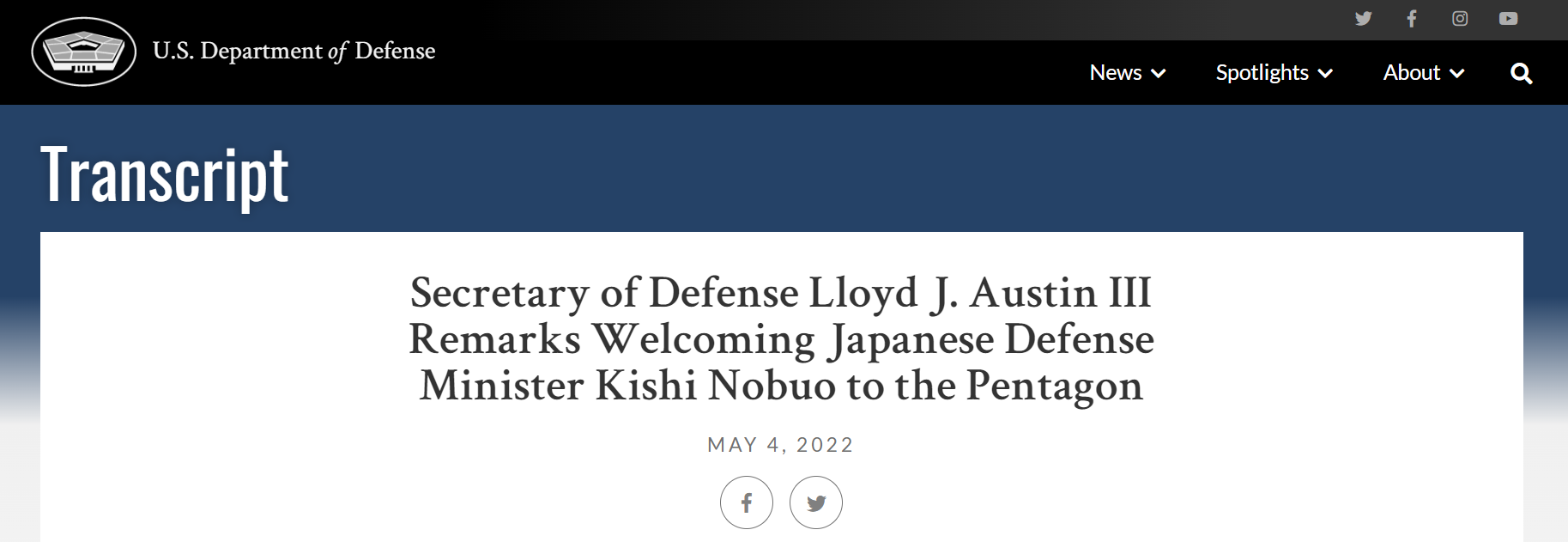 奥斯丁在会谈前表示,美日同盟是印太地区和平与繁荣的基石,美日有着深厚友谊与信任,也有共同利益与价值观。他谈到俄罗斯入侵乌克兰是对基于规则的国际秩序的污辱,也对全球人民自由构成挑战,美方感谢日本在这场危机中发挥作用,协助乌克兰人民捍卫主权。