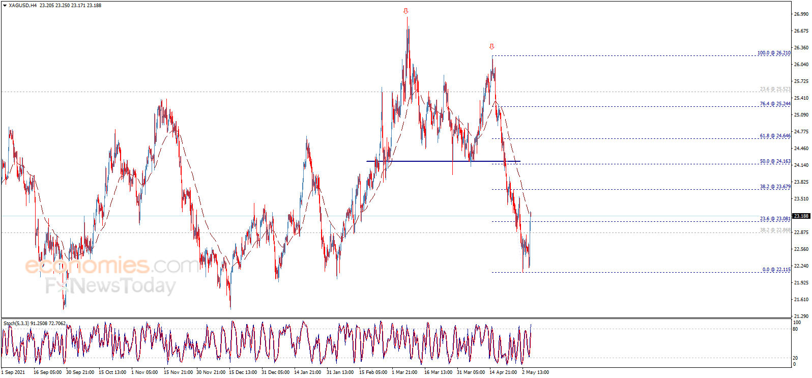Economies.com预计,今日银价交投将位于支撑位22.80美元/盎司以及阻力位23.75美元/盎司之间。