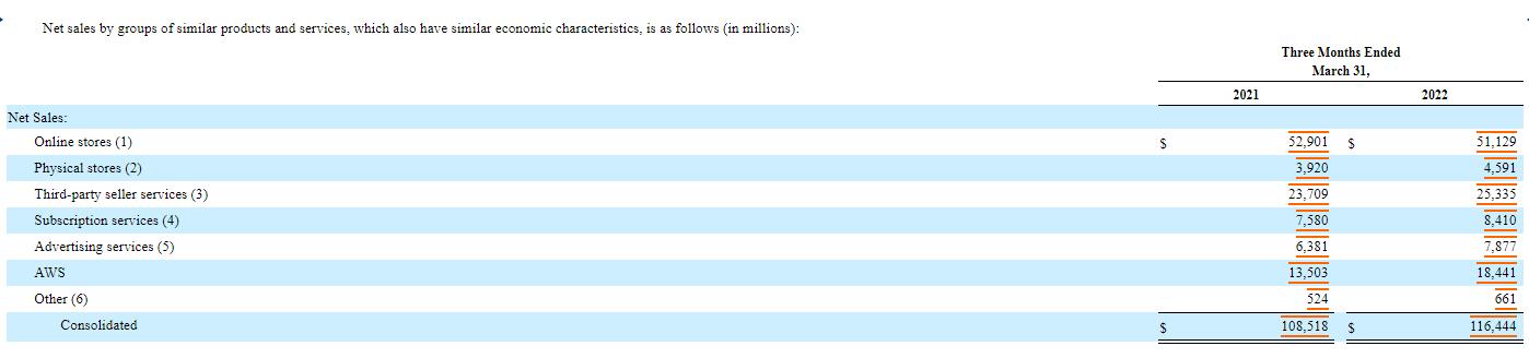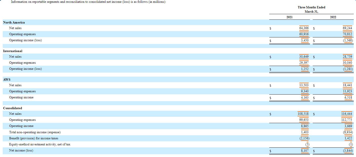 根据财报显示,整体来看,第一季度,亚马逊净销售额为1164.44亿美元,与去年同期的1085.18亿美元相比增长7%,不计入汇率变动的影响为同比增长9%;营业收入为37亿美元,同比去年的89亿美元下滑58%;净亏损为38.44亿美元,而去年同期的净利润为81.07亿美元;为七年来首次出现季度亏损。运营利润为36.69亿美元,相比之下上年同期为88.65亿美元。