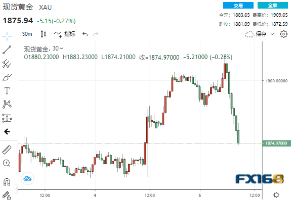 随着美元和美债收益率飙升,现货黄金自高位大幅回落37美元,刷新日低至1872.59美元。