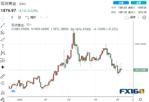 美市尾盘,现货黄金收报1876.97元/盎司,下跌4.12美元或0.22%,日内最高触及1909.65美元/盎司,最低触及1872.38美元/盎司。