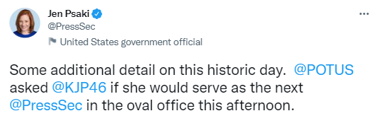 普萨基也在推特发文透露,拜登于周四下午在白宫椭圆形办公室的一场会议,向皮埃尔提出这份工作邀请。她写道:“我等不及看她发光发亮,把自己的风格、才华和优雅带到发言台上。”
