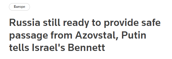 FX168财经报社(香港)讯 俄罗斯总统普京5日与以色列总理班内特(Benjamin Bennett)通电话,根据克里姆林宫发布的通话内容,普京对班内特表示,乌克兰应下令被俄罗斯军队围攻许久的南部港口城市马里乌波尔(Mariupol)亚速钢铁厂(Azovstal)内的士兵放下武器并投降。莫斯科官员称,普京强调俄军已准备好为被困在钢铁厂内的平民提供安全撤离通道。
