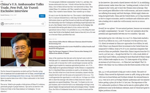 FX168财经报社(香港)讯 中国驻美大使秦刚日前接受美国《福布斯》杂志驻沪分社长范鲁贤(Russell Flannery)的视频专访,主要就中美经贸关系及双边经贸协议、企业投资、营商环境等回答提问。秦刚表示,美国政府是时候重新考虑并尽早取消加征的关税了。