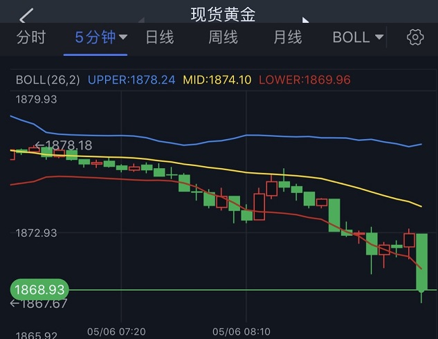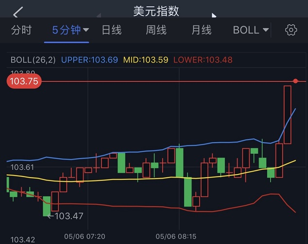 FX168财经报社(香港)讯 周五(5月6日)亚市早盘,美元指数短线跳升,现报103.75附近。现货黄金快速下跌,金价刚刚失守1870美元/盎司;现货白银也短线急跌,日内跌幅达到近1%。