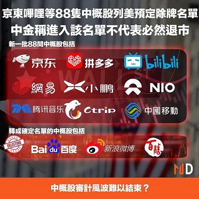 谢金河表示,除此之外还有更大的消息,美国证券交易委员会(SEC)的“外国公司问责法”,明白框列88家中资企业是准下市名单,也就是原先的17家再加上88家,共有105家企业面临从美国股市下市的危机,这些公司包括赫赫有名的百度,京东,中国移动,中国铝业,蔚来汽车,百胜中国,东方航空,南方航空,拼多多,哔哩哔哩,腾讯音乐。
