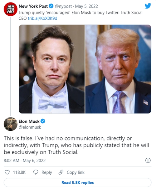 FX168财经报社(北美)讯 周五(5月6日),特斯拉CEO马斯克断然否认了美国前总统特朗普新成立的社交媒体公司负责人的说法,即特朗普鼓励马斯克收购推特(Twitter)。