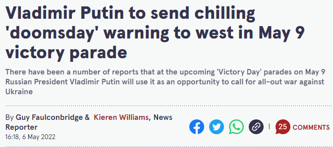 5月9日之前,莫斯科和西方国家纷纷猜测,普京正准备就乌克兰问题发表某种特别声明,可能是直接宣战,甚至是全国动员。