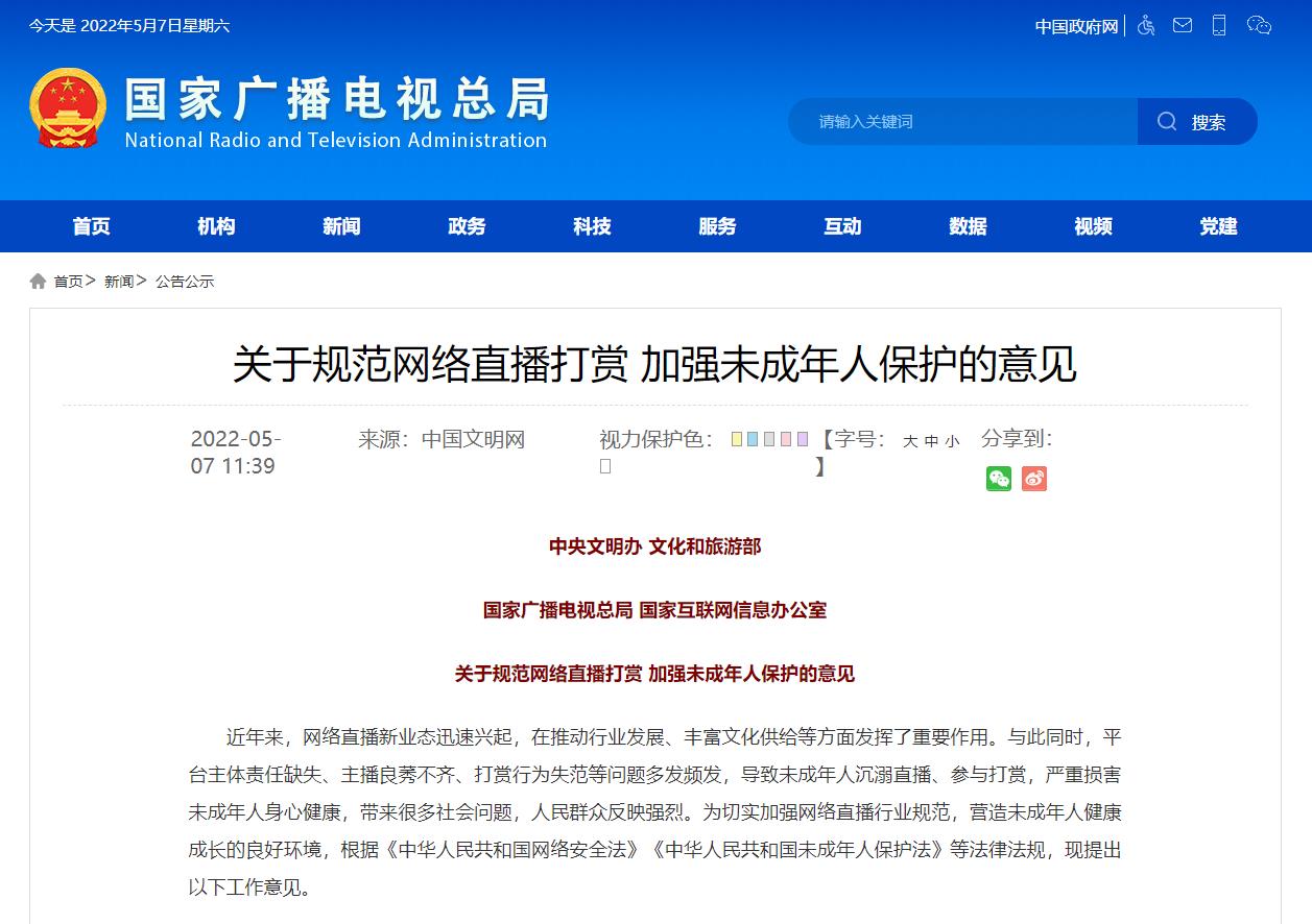 中国国家广电总局的声明显示,在线直播平台需要禁止未成年人给直播者打赏。认为此举严重损害未成年人身心健康,带来很多社会问题。