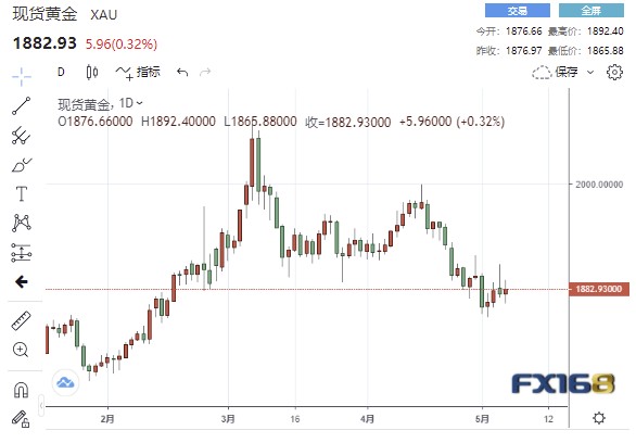 周五(5月6日),美市尾盘,现货黄金收报1882.93元/盎司,上涨5.96美元或0.32%,日内最高触及1892.40美元/盎司,最低触及1865.88美元/盎司。本周,现货黄金下跌14.09美元或0.74%,为连续第3周下跌。