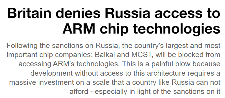 俄媒《生意人报》报道,英国于本月4日公布最新制裁名单,将俄罗斯2家处理器制造商巨头MCST,也就是生产Elbrus处理器的负责企业,还有贝加尔电子,负责生产Baikal处理器,都列入制裁清单,不仅冻结2家半导体厂商的资产,英国企业对其提供技术服务的业务也将受到严格管制。这也就意味着,俄罗斯芯片设计企业将会无法使用安谋的IP来设计处理器。