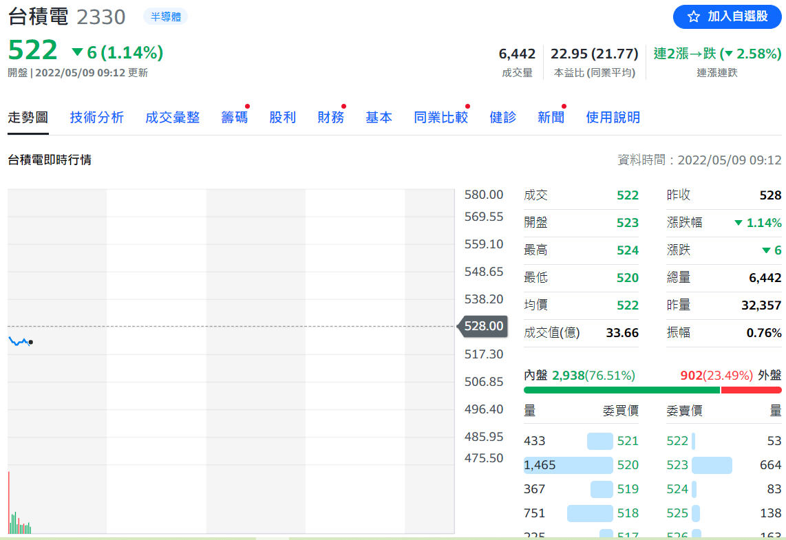 截至9日亚市早盘9时13分,台积电短线跌落至台币522元,跌破关键台币523元的关键支撑,掀起全台市场投资者的恐慌情绪。