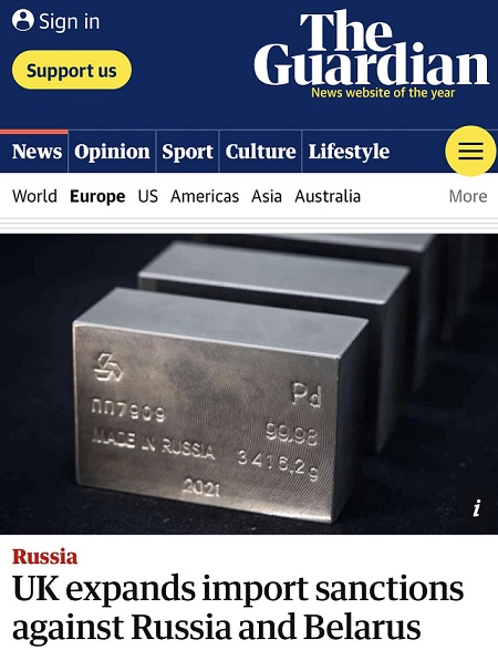 英国国际贸易部表示,俄罗斯在贵金属出口方面高度依赖英国,而英国将对这些贵金属额外征收35%的进口关税。