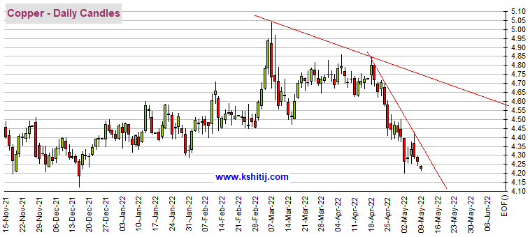 铜方面,Kshitij咨询服务团队表示,铜期货如预期的那样进一步下跌,并可能像之前提到的那样继续跌向4.15-4.00美元/磅。假如未能守在4.15-4.00美元/磅上方,这可能会拖累铜价在较长期内进一步走低。